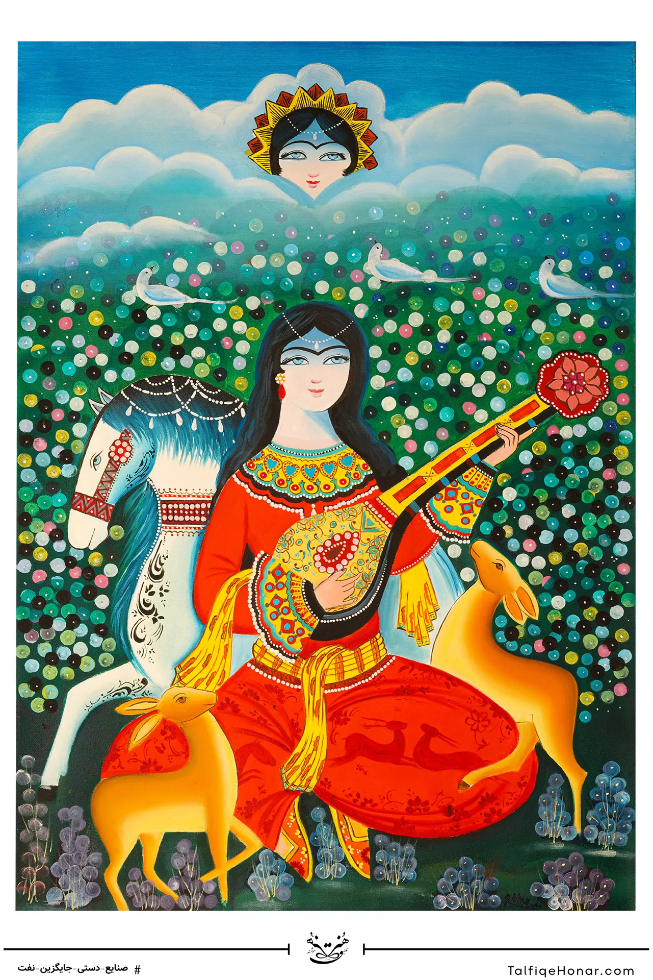 در این تابلو، «دختر نوازنده» چنان در نغمههایش غرق شده که گویی جهان پیرامون محو شده و تنها وی و سازش باقی ماندهاند. هنرمند نقاش، این اتصال روحی را در قالب رنگهایی سیال و ضربات قلممویی پُرقدرت به دام انداخته است.